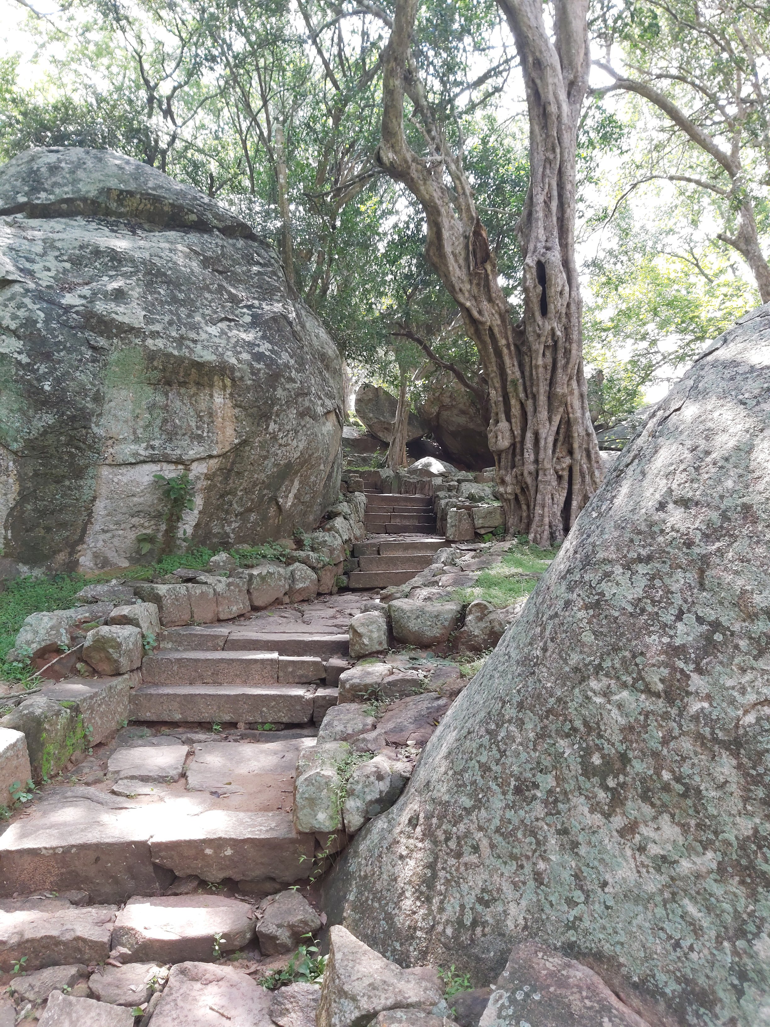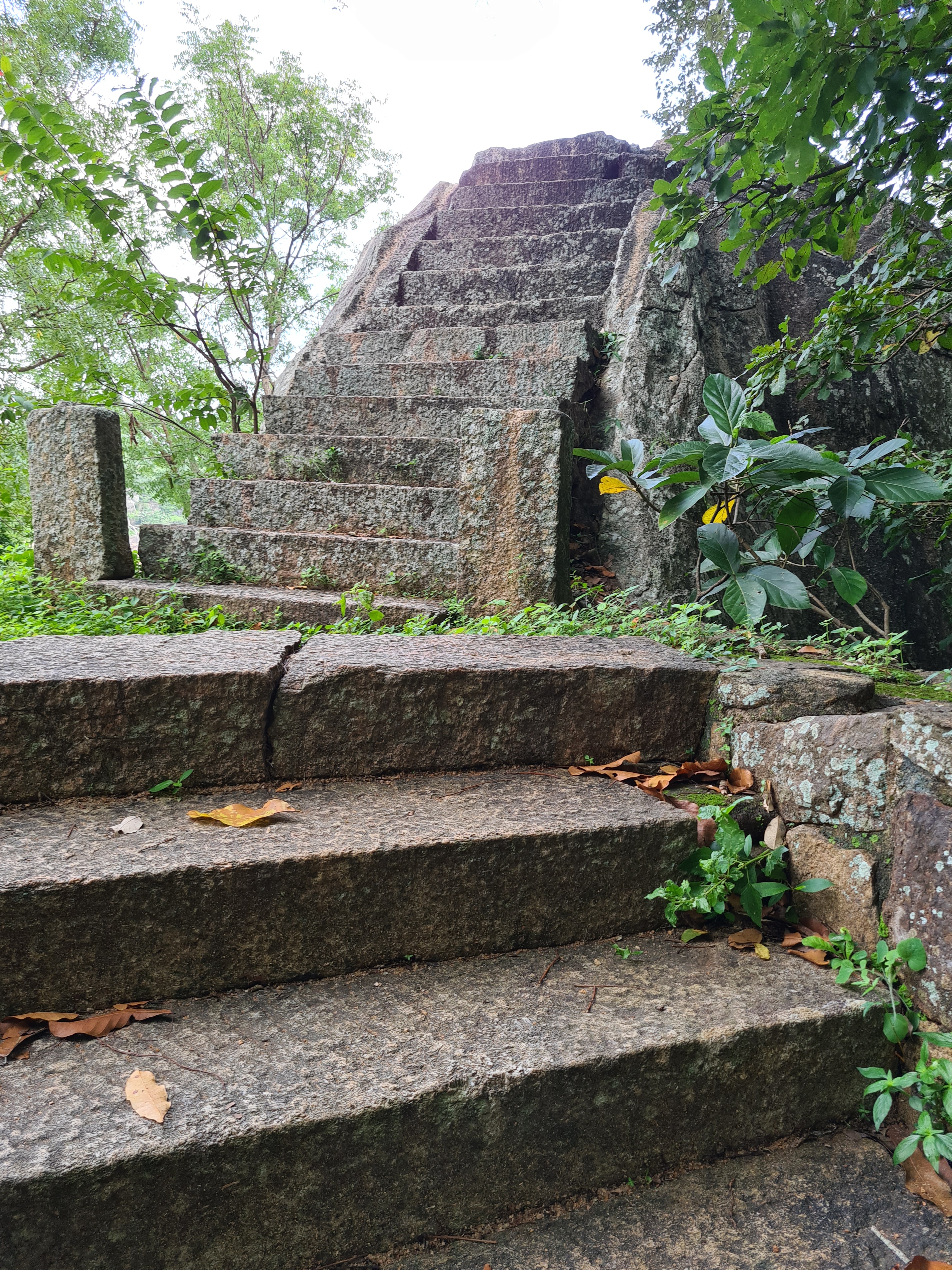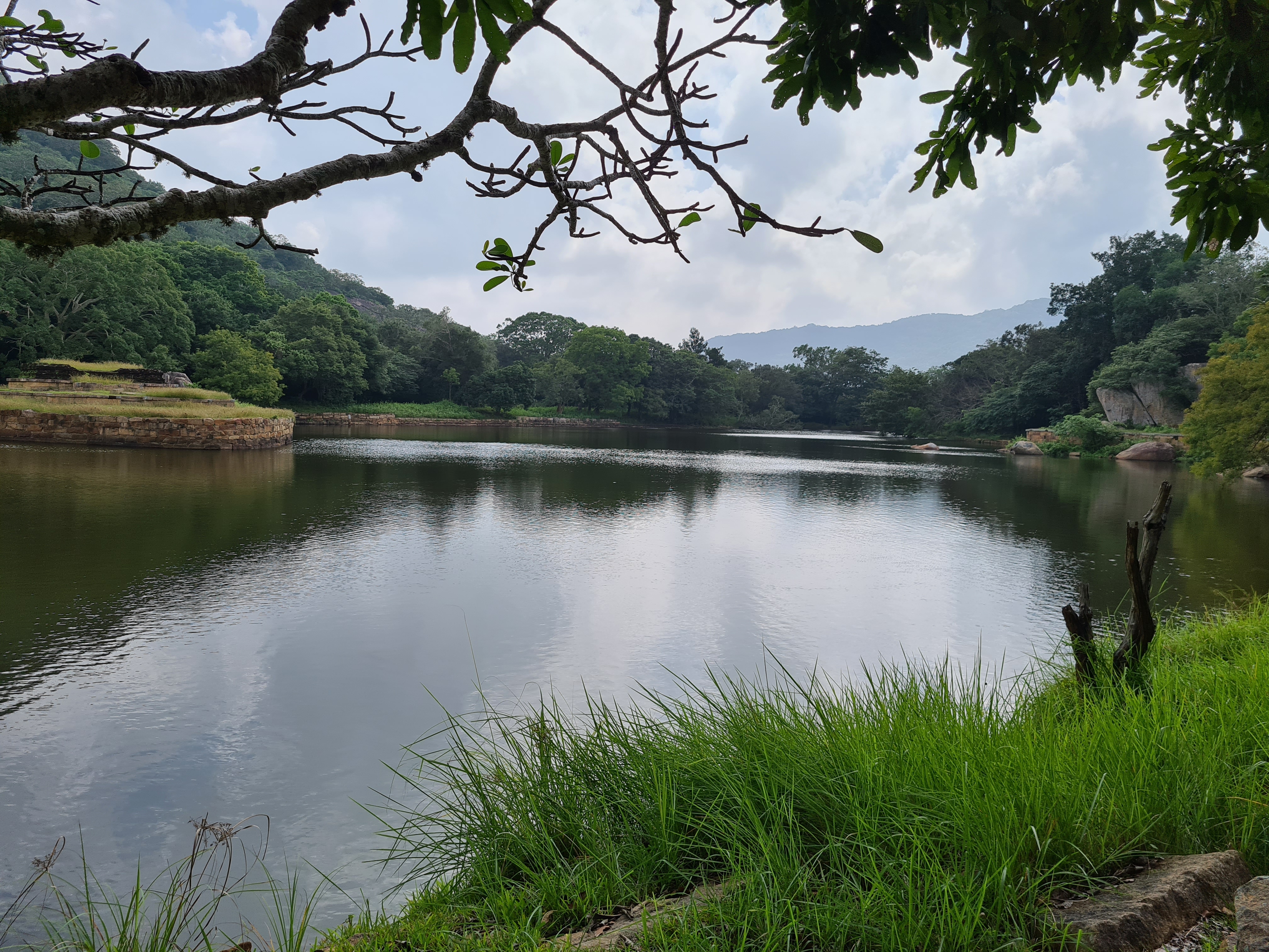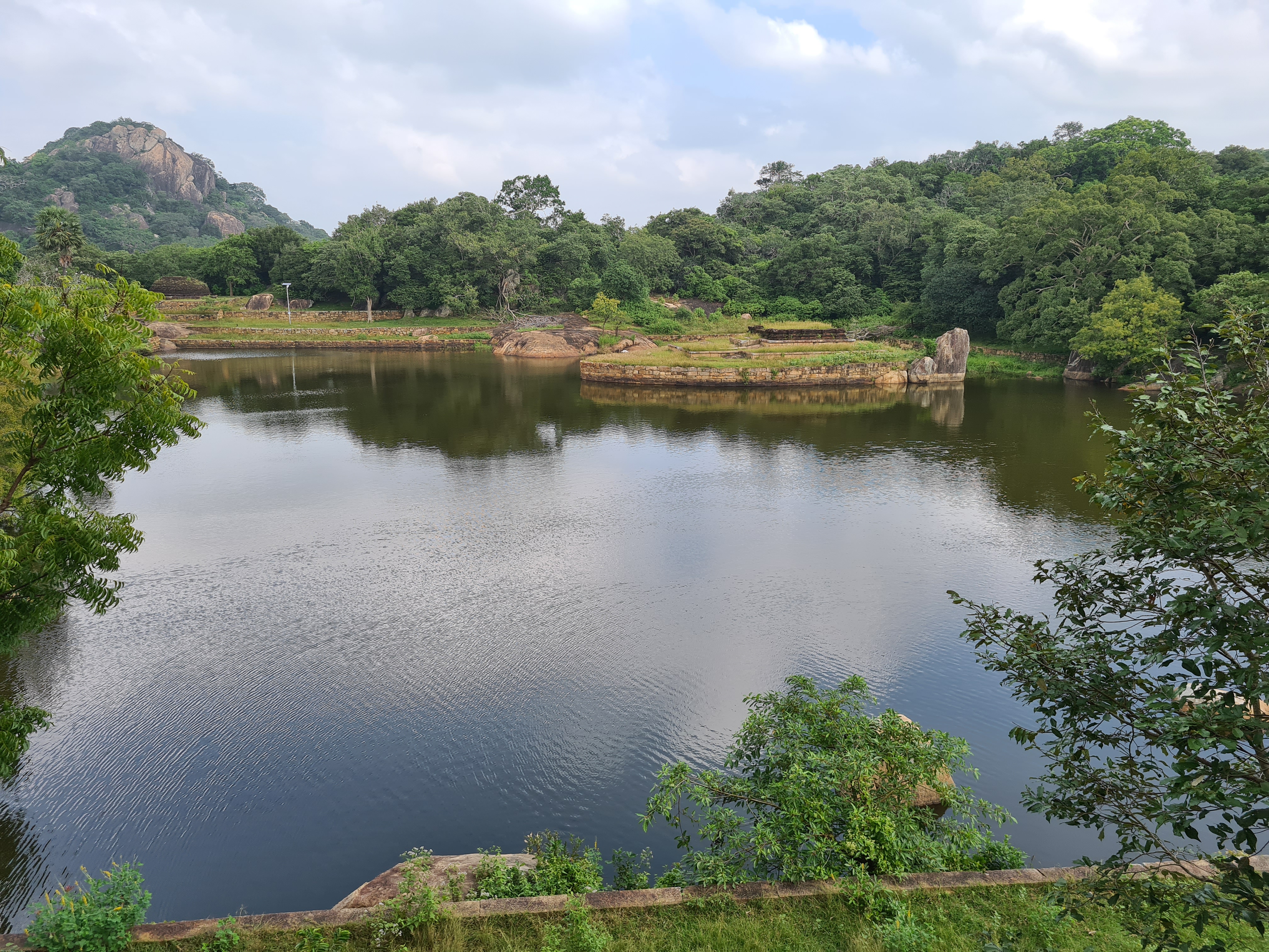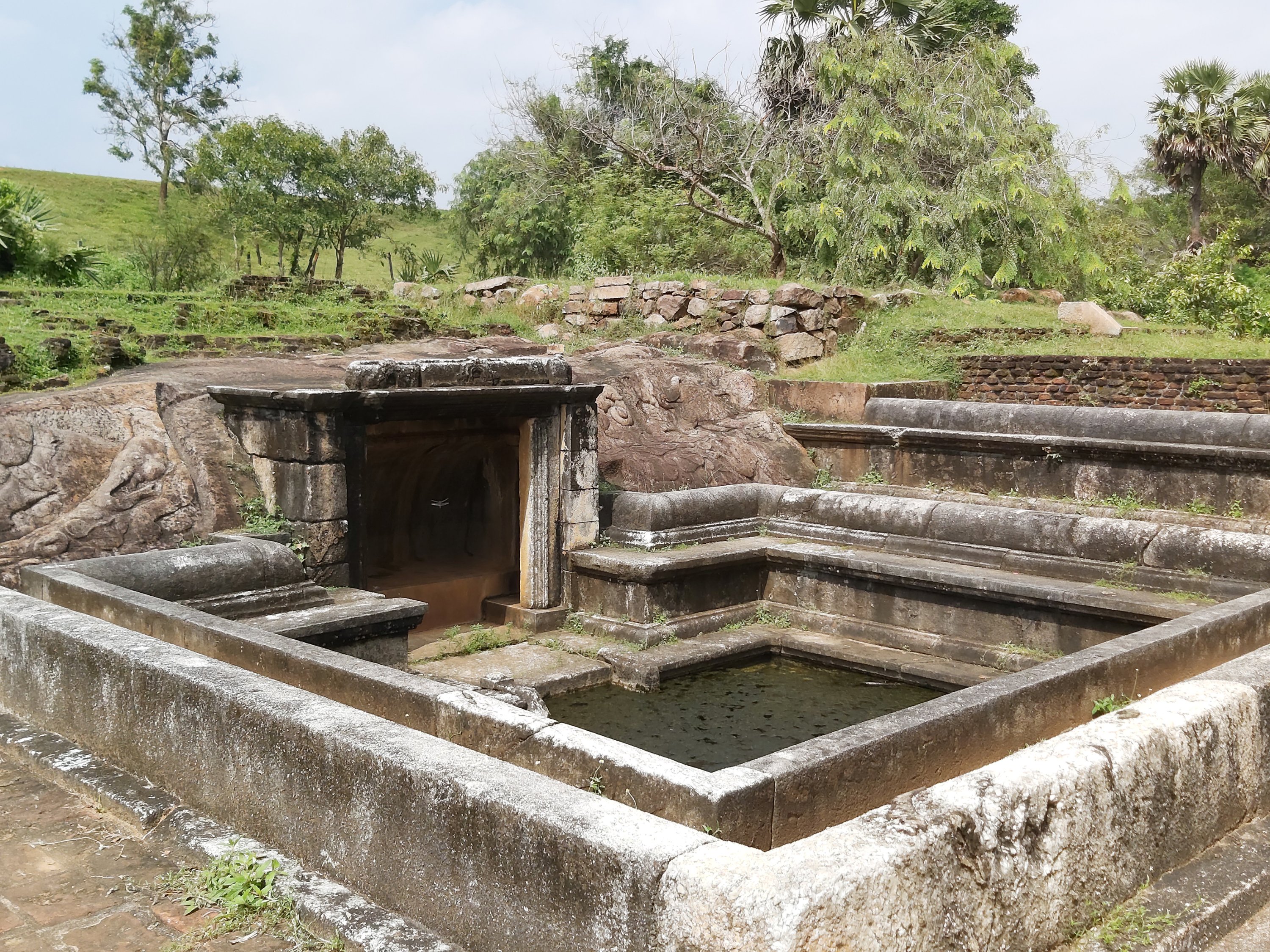 The ruins currently under restoration is thought to be that of a monastic retreat. At the start of the current trail is a gigantic man made pond thought to be the largest in Asia if not the world. Encompassing an area of 2.5 acres would have been a sight to see in its time. Currently this has been partly restored. Further down the trail, one is treated to exquisite stair ways the quality of pricision even todays technology would be hard pressed to deliver. The sharp edged stones and interlocking assembly speaks of a advanced technology lost to mankind now. The stone bridge which is to date sturdy as when it was set is engineering feat to behold. The Meandering stone laid path way up the hill is easy to climb due to gentle slope maintained. The path way has resting places at intervals to rest any weary feet. It is set in a circular fashion so that the monks can continue their walking meditation whilst resting and one such resting place has had water filled foot bath to soak ones feet. The carving of the stones in circular fashion is though provoking. The path leads to first of 2 buildings which is thought to have been surrounded by water with elevated floor boards. There are air inlets below the flow boards, which would have had a very cooling effect when air blows over the water. The area around these buildings and path way is littered with ruins of many other buildings. Off the path way is a man made waterfall, functioning even today. Made by blocking a water way with large carved stone slabs and the area below the water fall fashioned such that one could sit under the falling water or meditate. Stone steps carved in the rock enables one to climb to the sitting platform. The back of the waterfall and the surrounding is properly walled up to create a neat bathing pool.