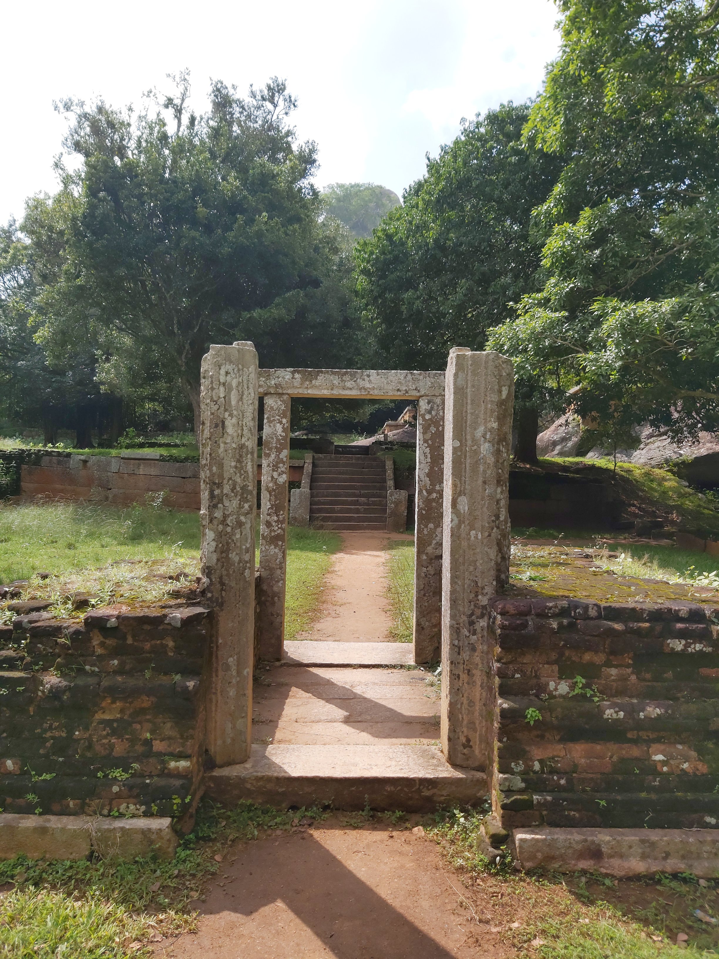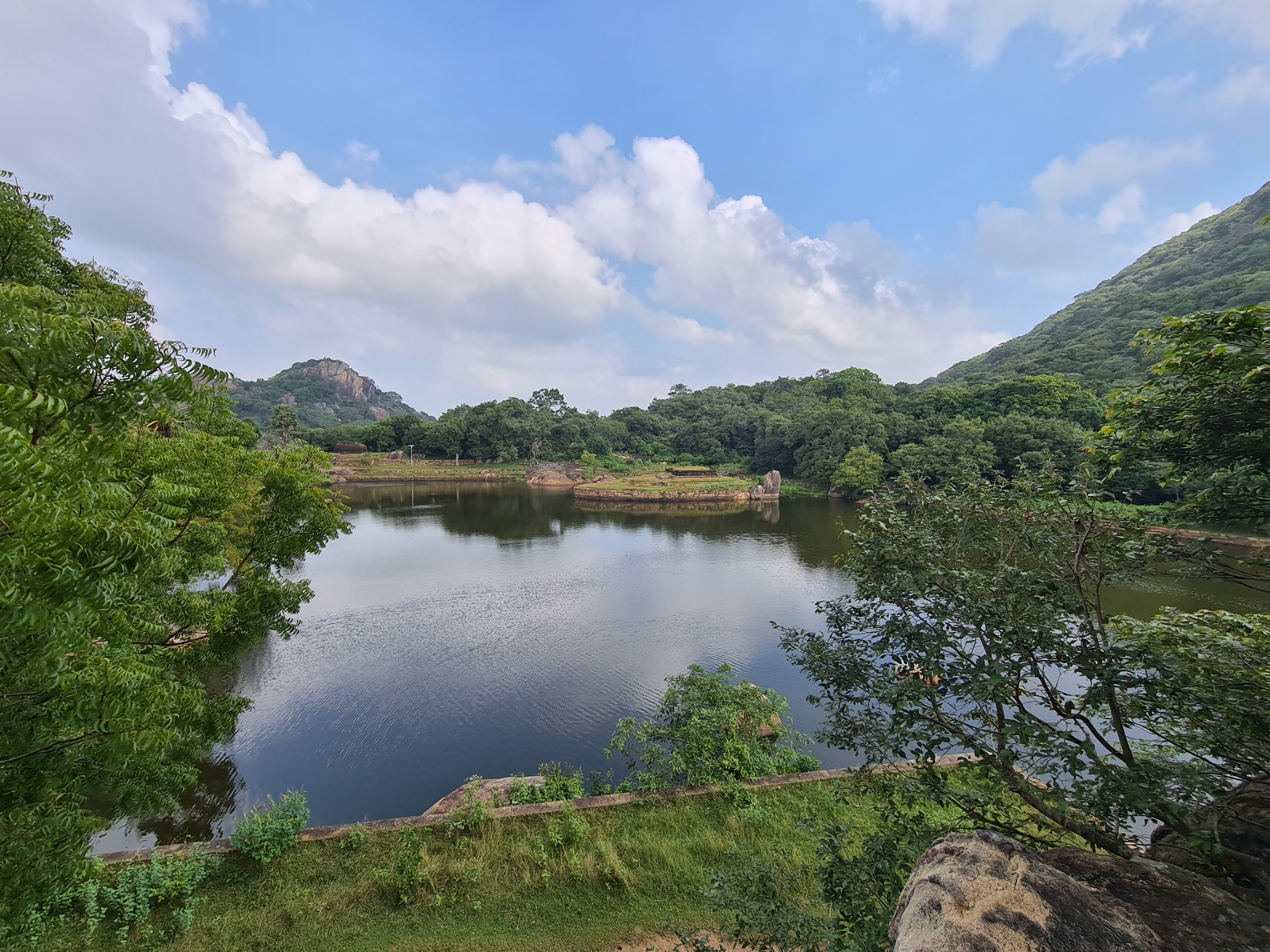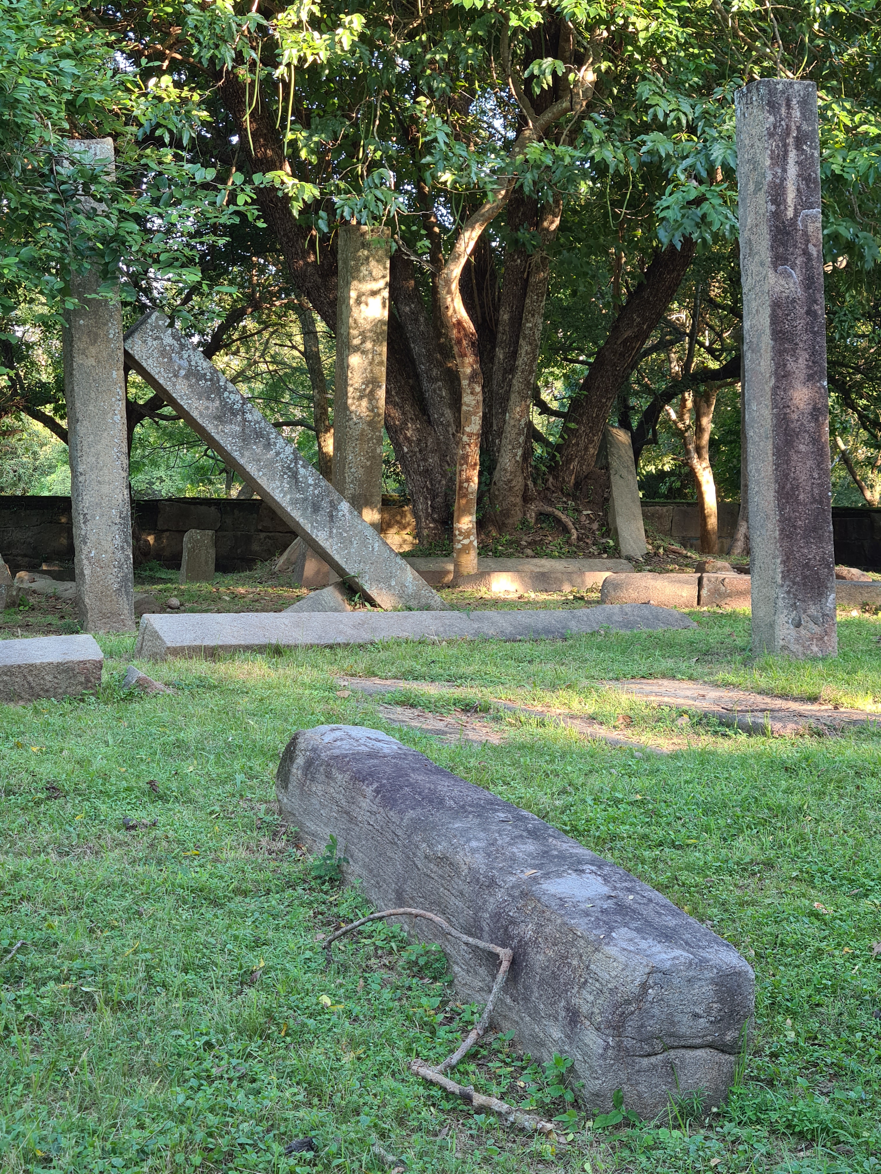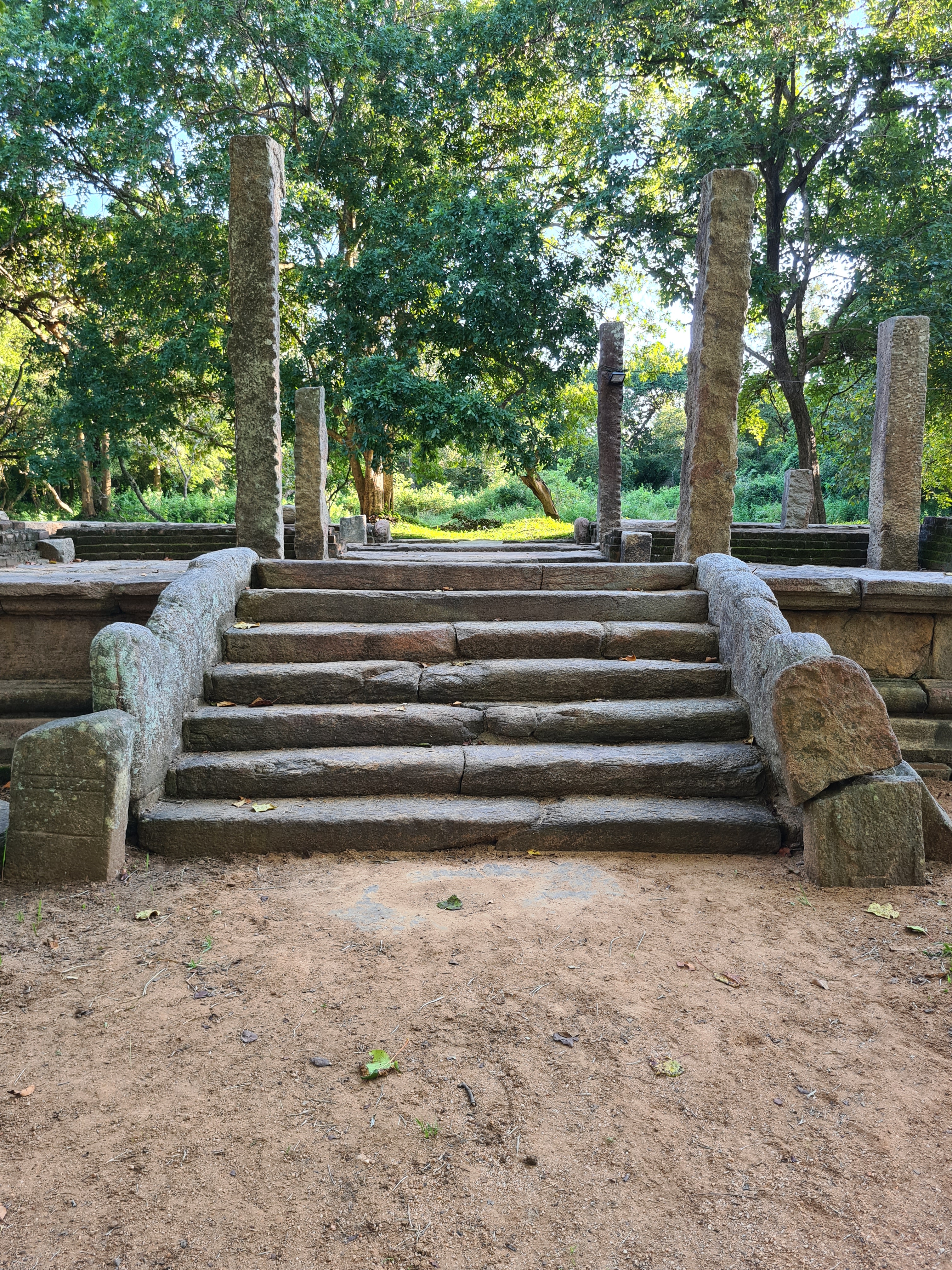 The ruins currently under restoration is thought to be that of a monastic retreat. At the start of the current trail is a gigantic man made pond thought to be the largest in Asia if not the world. Encompassing an area of 2.5 acres would have been a sight to see in its time. Currently this has been partly restored. Further down the trail, one is treated to exquisite stair ways the quality of pricision even todays technology would be hard pressed to deliver. The sharp edged stones and interlocking assembly speaks of a advanced technology lost to mankind now. The stone bridge which is to date sturdy as when it was set is engineering feat to behold. The Meandering stone laid path way up the hill is easy to climb due to gentle slope maintained. The path way has resting places at intervals to rest any weary feet. It is set in a circular fashion so that the monks can continue their walking meditation whilst resting and one such resting place has had water filled foot bath to soak ones feet. The carving of the stones in circular fashion is though provoking. The path leads to first of 2 buildings which is thought to have been surrounded by water with elevated floor boards. There are air inlets below the flow boards, which would have had a very cooling effect when air blows over the water. The area around these buildings and path way is littered with ruins of many other buildings. Off the path way is a man made waterfall, functioning even today. Made by blocking a water way with large carved stone slabs and the area below the water fall fashioned such that one could sit under the falling water or meditate. Stone steps carved in the rock enables one to climb to the sitting platform. The back of the waterfall and the surrounding is properly walled up to create a neat bathing pool.