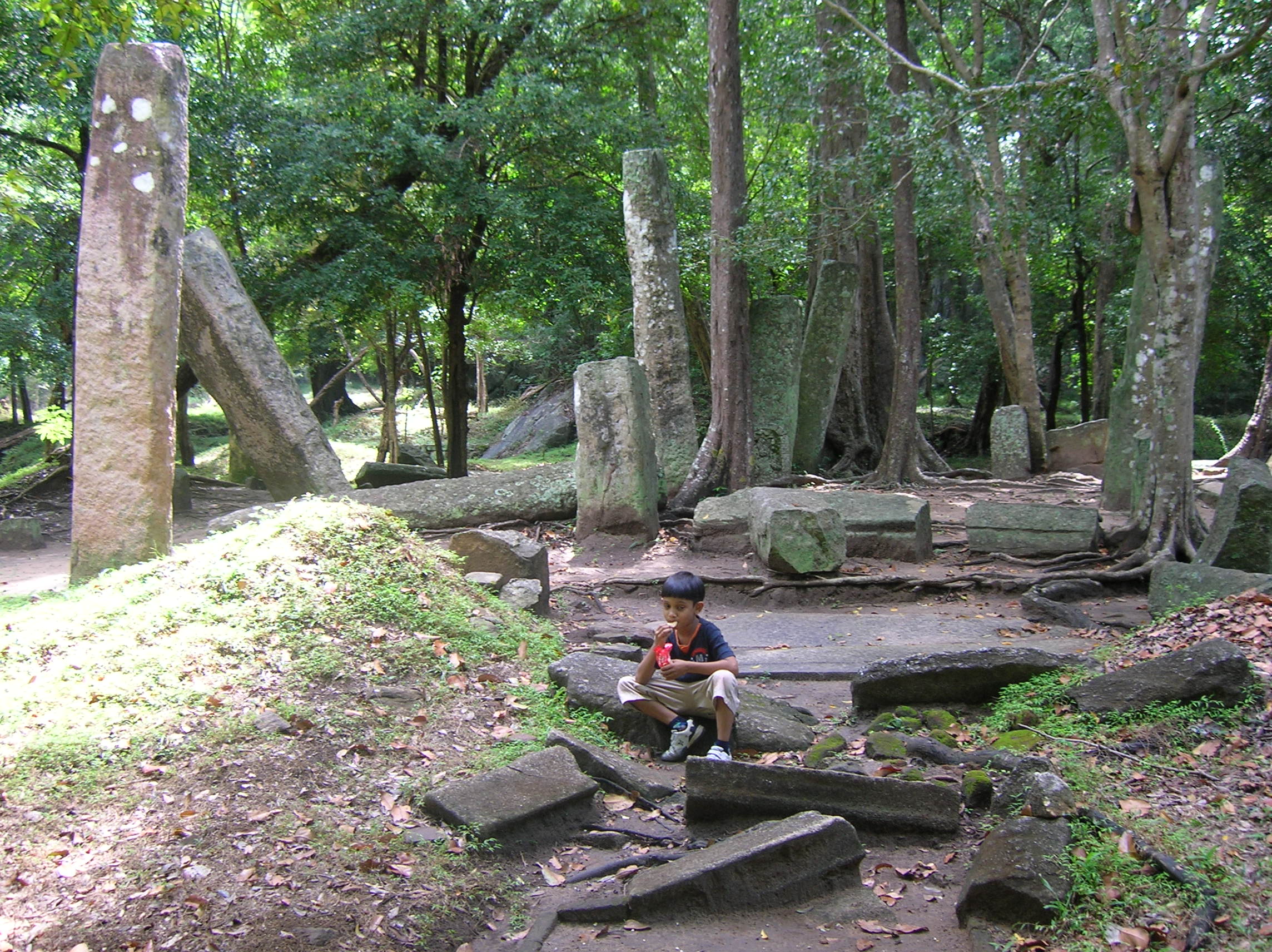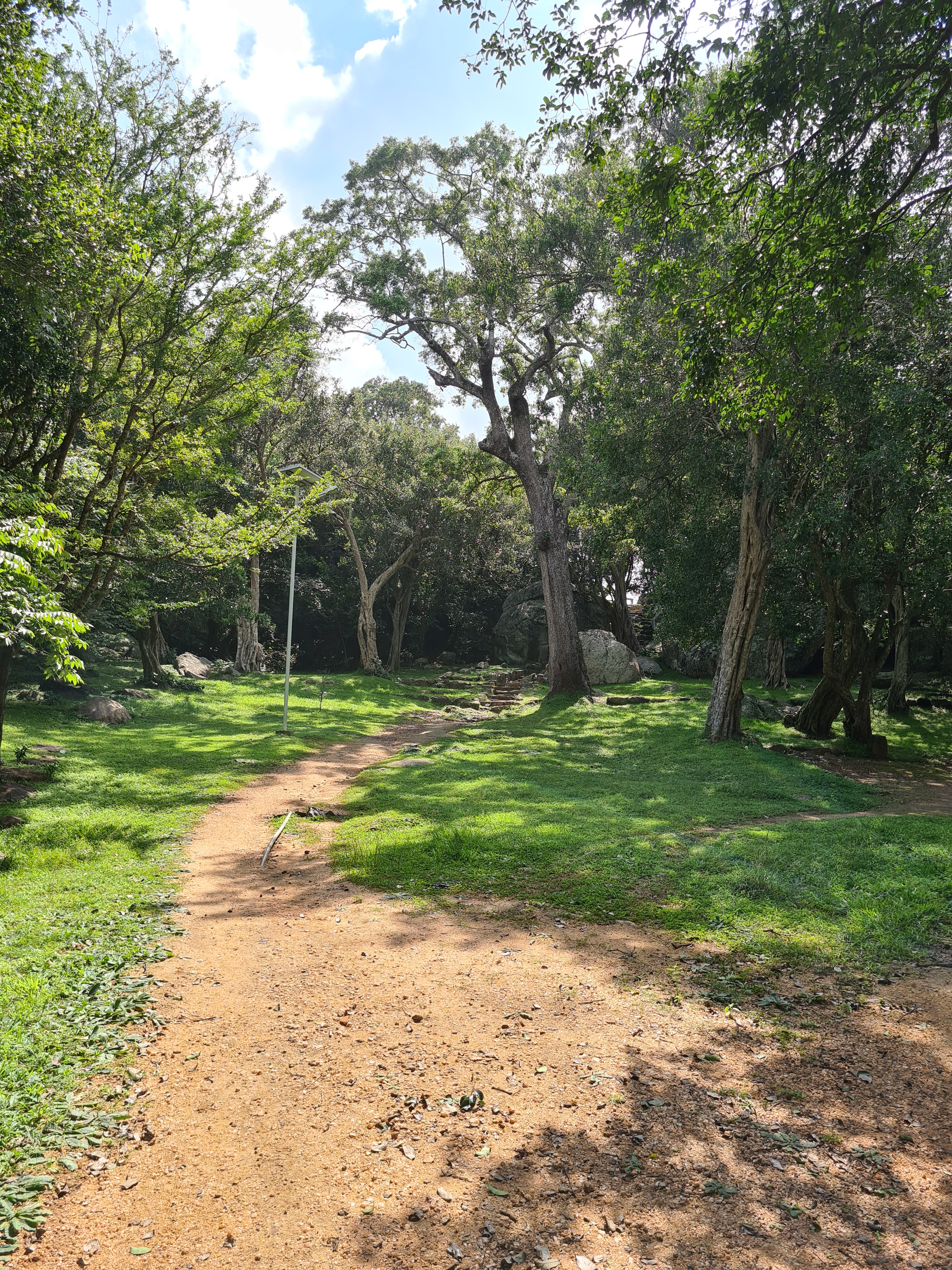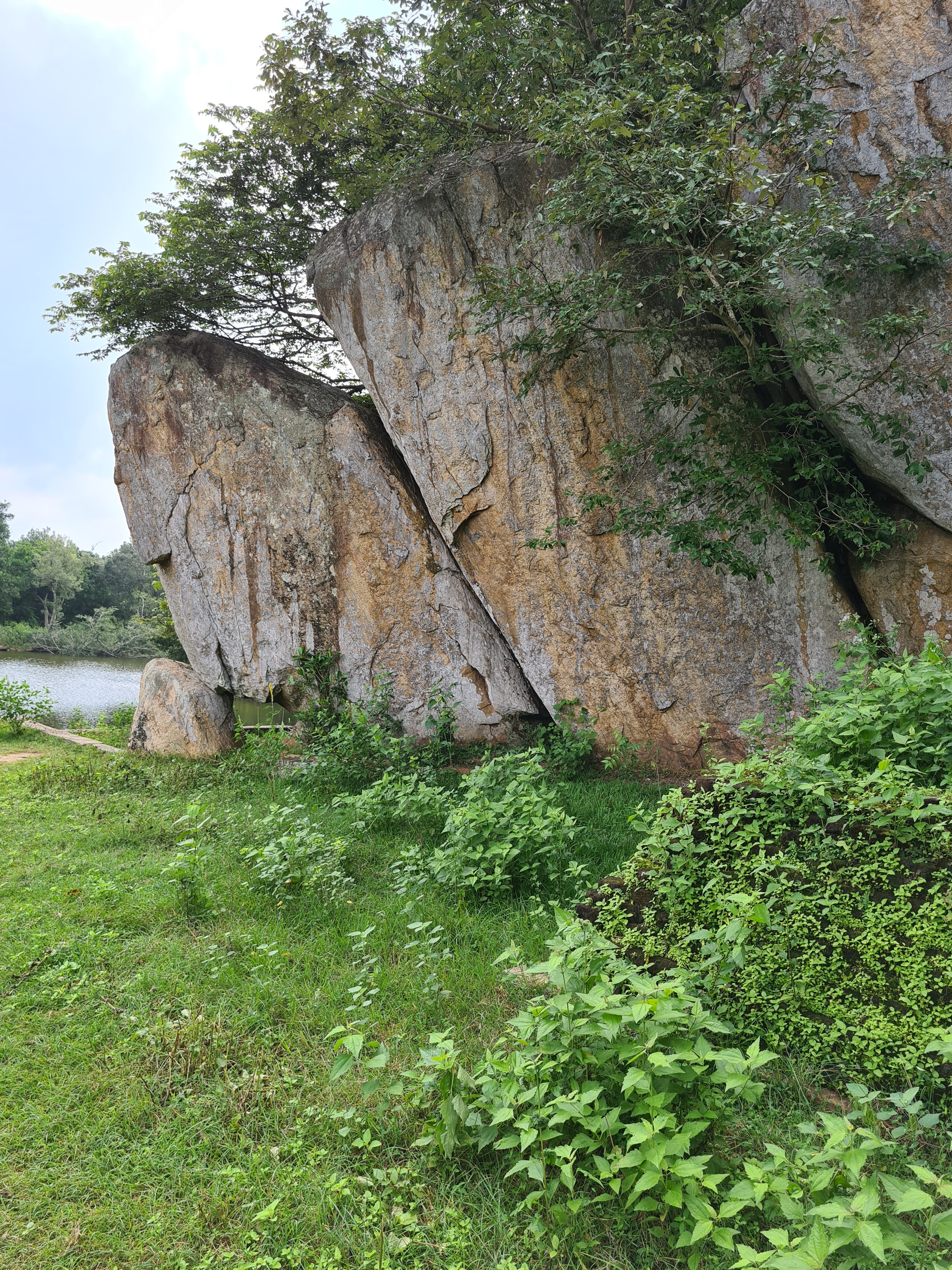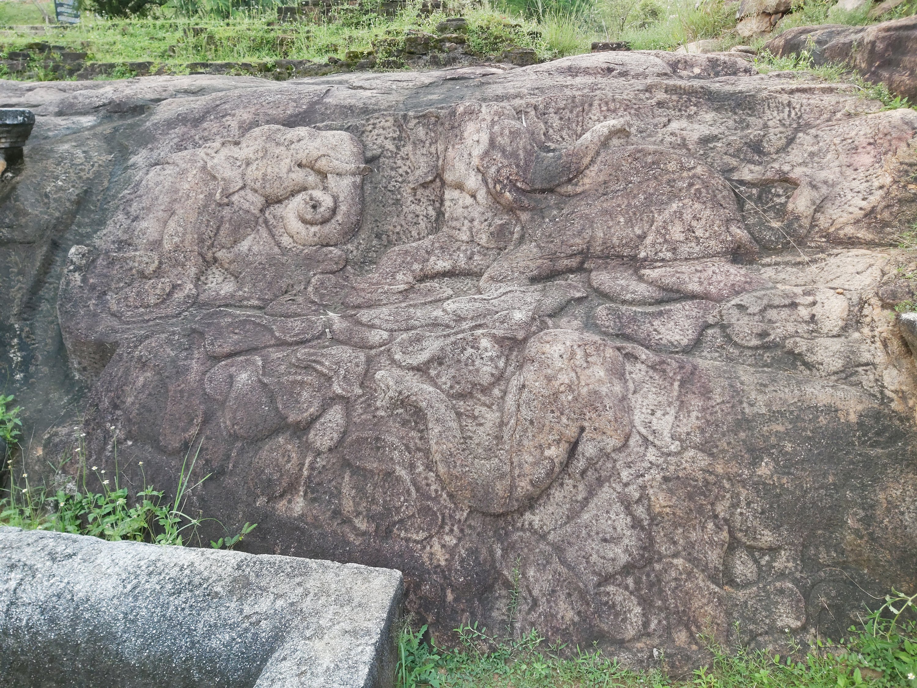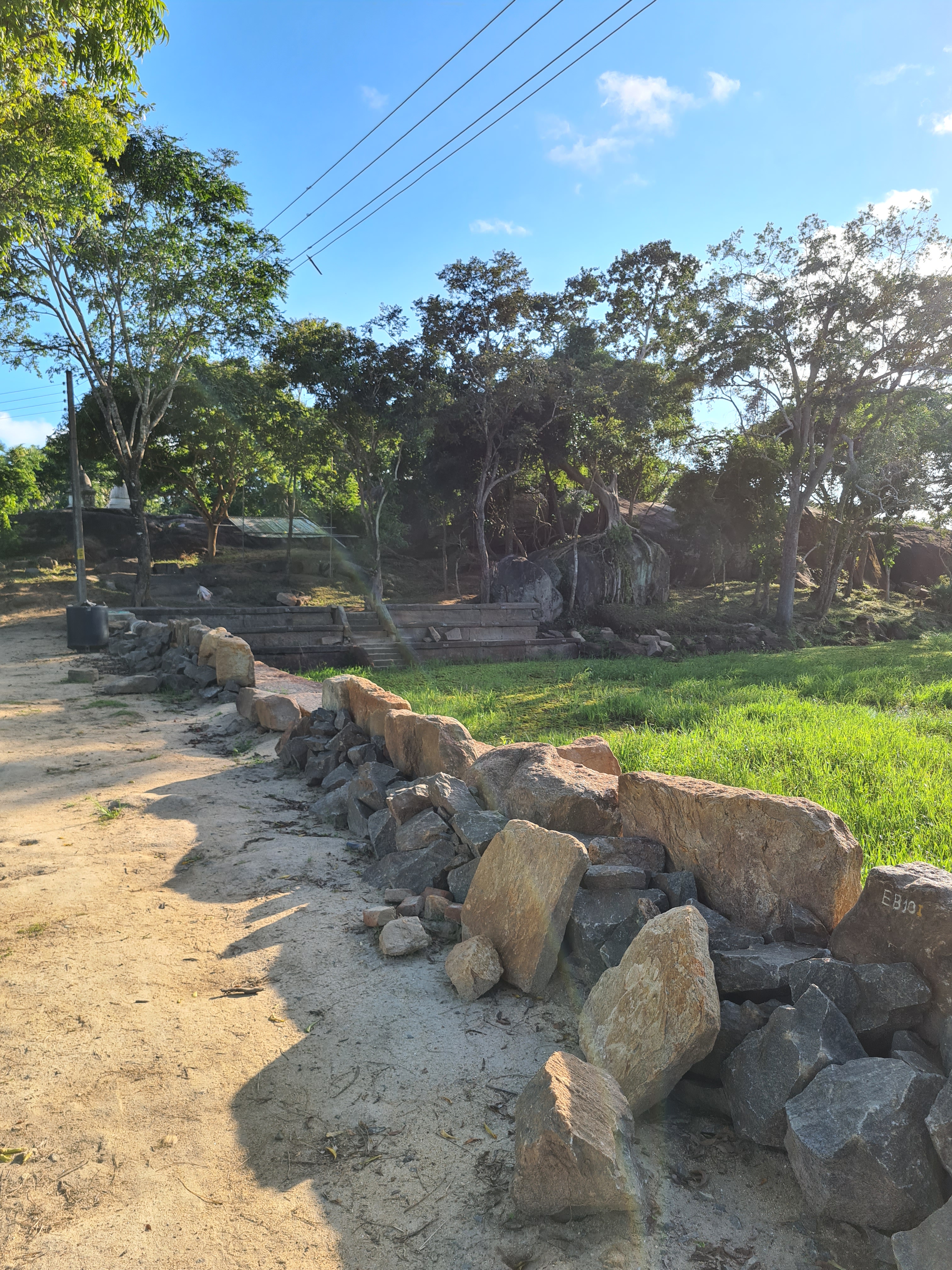 The ruins currently under restoration is thought to be that of a monastic retreat. At the start of the current trail is a gigantic man made pond thought to be the largest in Asia if not the world. Encompassing an area of 2.5 acres would have been a sight to see in its time. Currently this has been partly restored. Further down the trail, one is treated to exquisite stair ways the quality of pricision even todays technology would be hard pressed to deliver. The sharp edged stones and interlocking assembly speaks of a advanced technology lost to mankind now. The stone bridge which is to date sturdy as when it was set is engineering feat to behold. The Meandering stone laid path way up the hill is easy to climb due to gentle slope maintained. The path way has resting places at intervals to rest any weary feet. It is set in a circular fashion so that the monks can continue their walking meditation whilst resting and one such resting place has had water filled foot bath to soak ones feet. The carving of the stones in circular fashion is though provoking. The path leads to first of 2 buildings which is thought to have been surrounded by water with elevated floor boards. There are air inlets below the flow boards, which would have had a very cooling effect when air blows over the water. The area around these buildings and path way is littered with ruins of many other buildings. Off the path way is a man made waterfall, functioning even today. Made by blocking a water way with large carved stone slabs and the area below the water fall fashioned such that one could sit under the falling water or meditate. Stone steps carved in the rock enables one to climb to the sitting platform. The back of the waterfall and the surrounding is properly walled up to create a neat bathing pool.