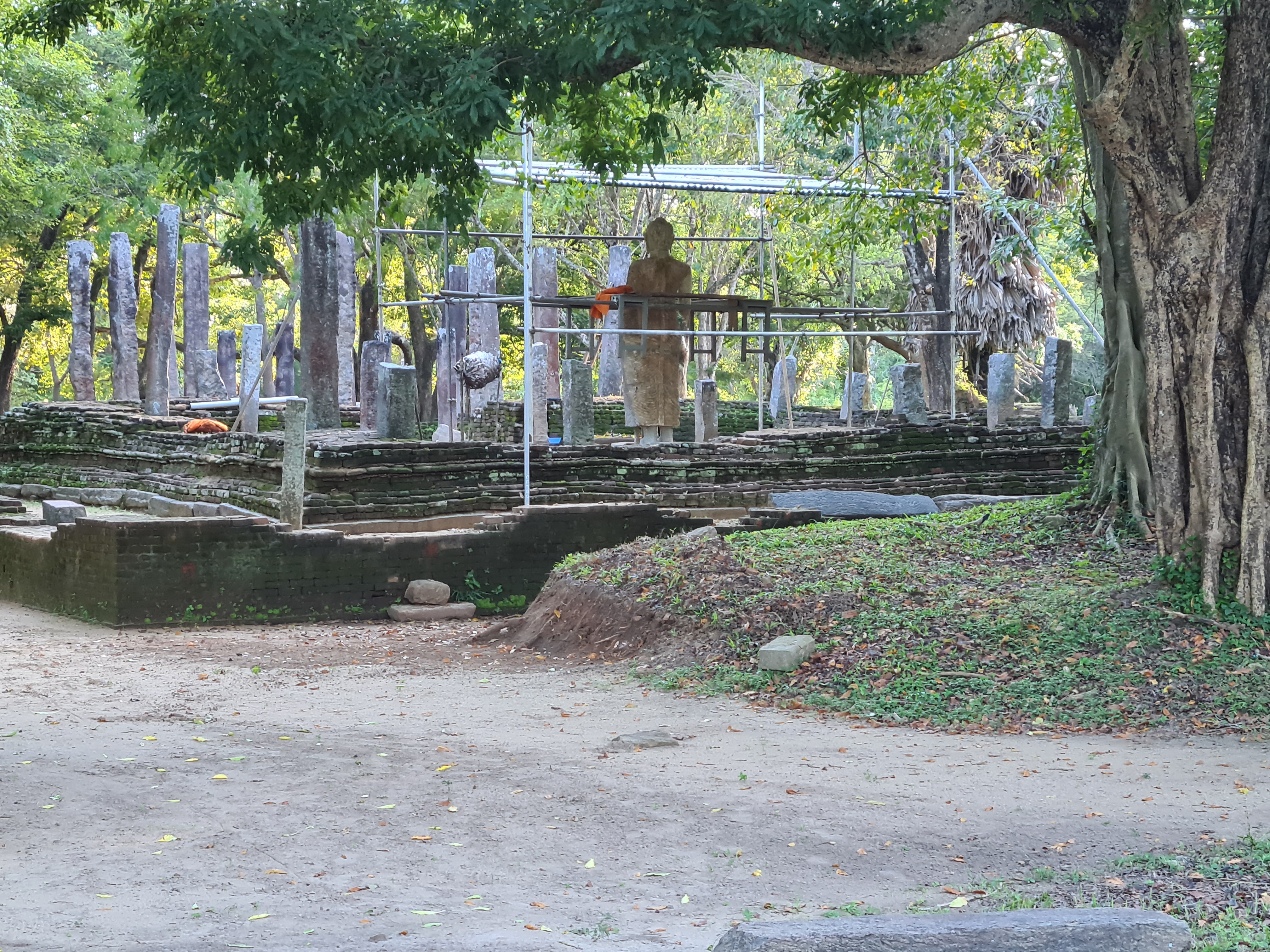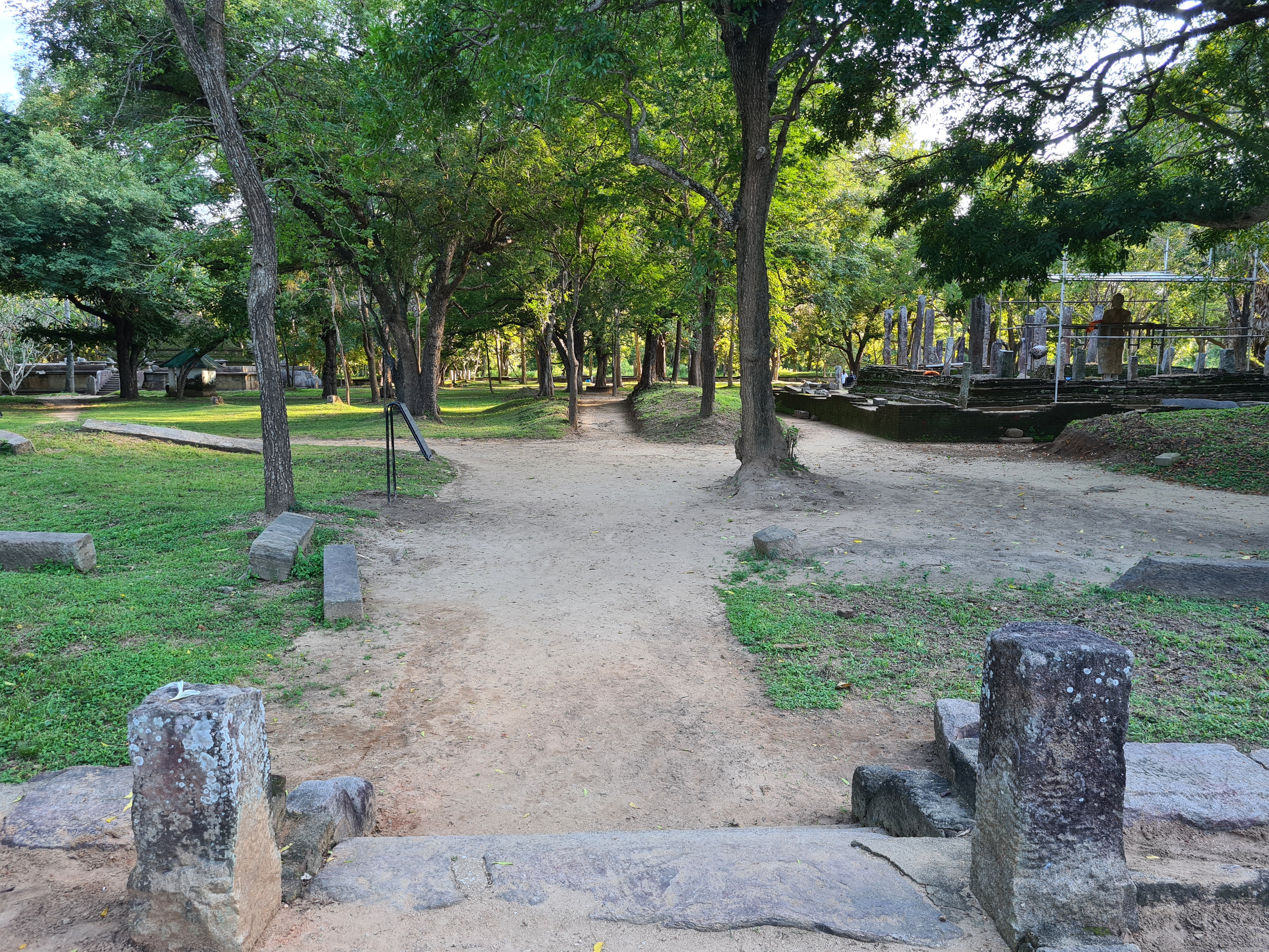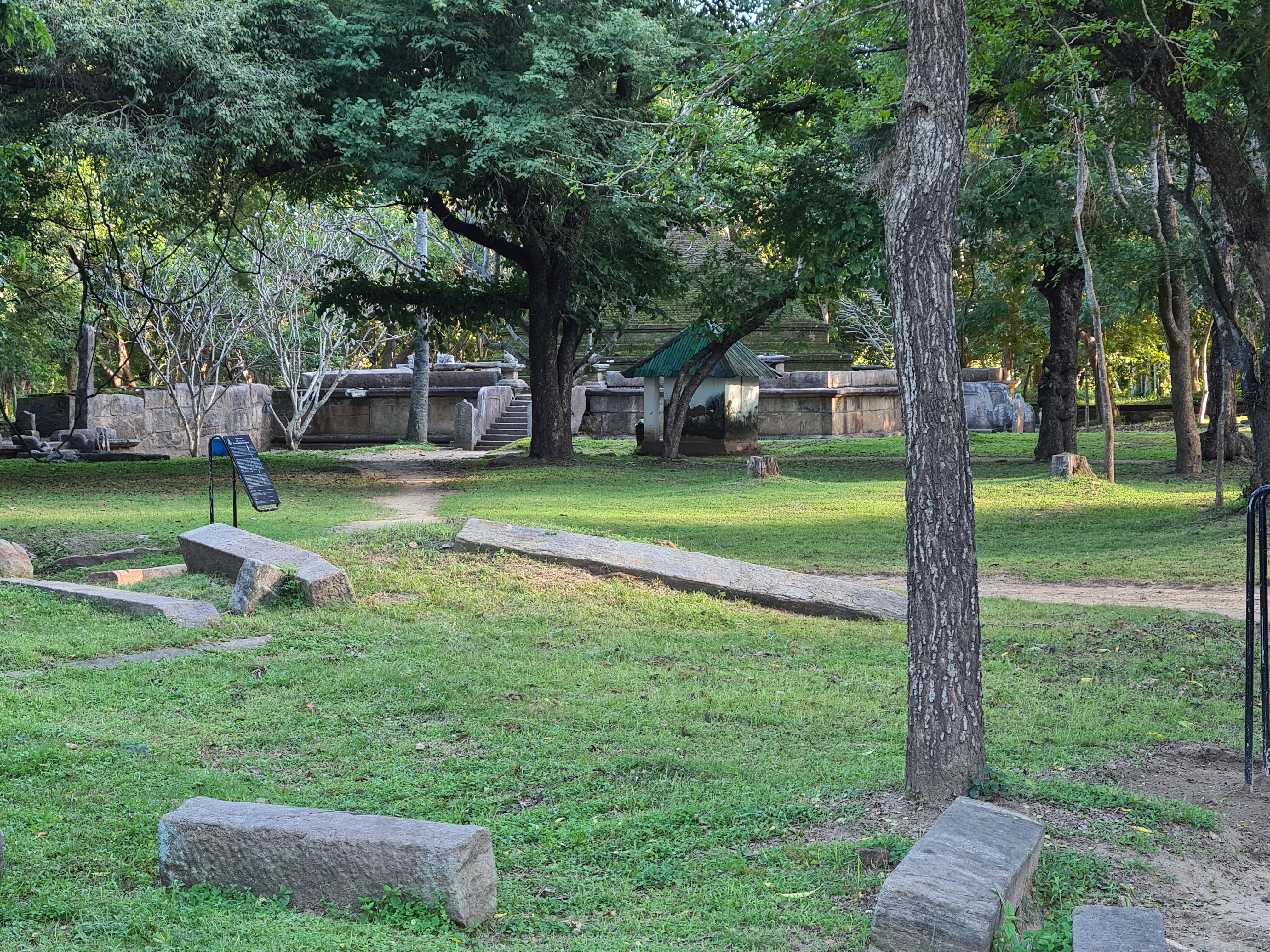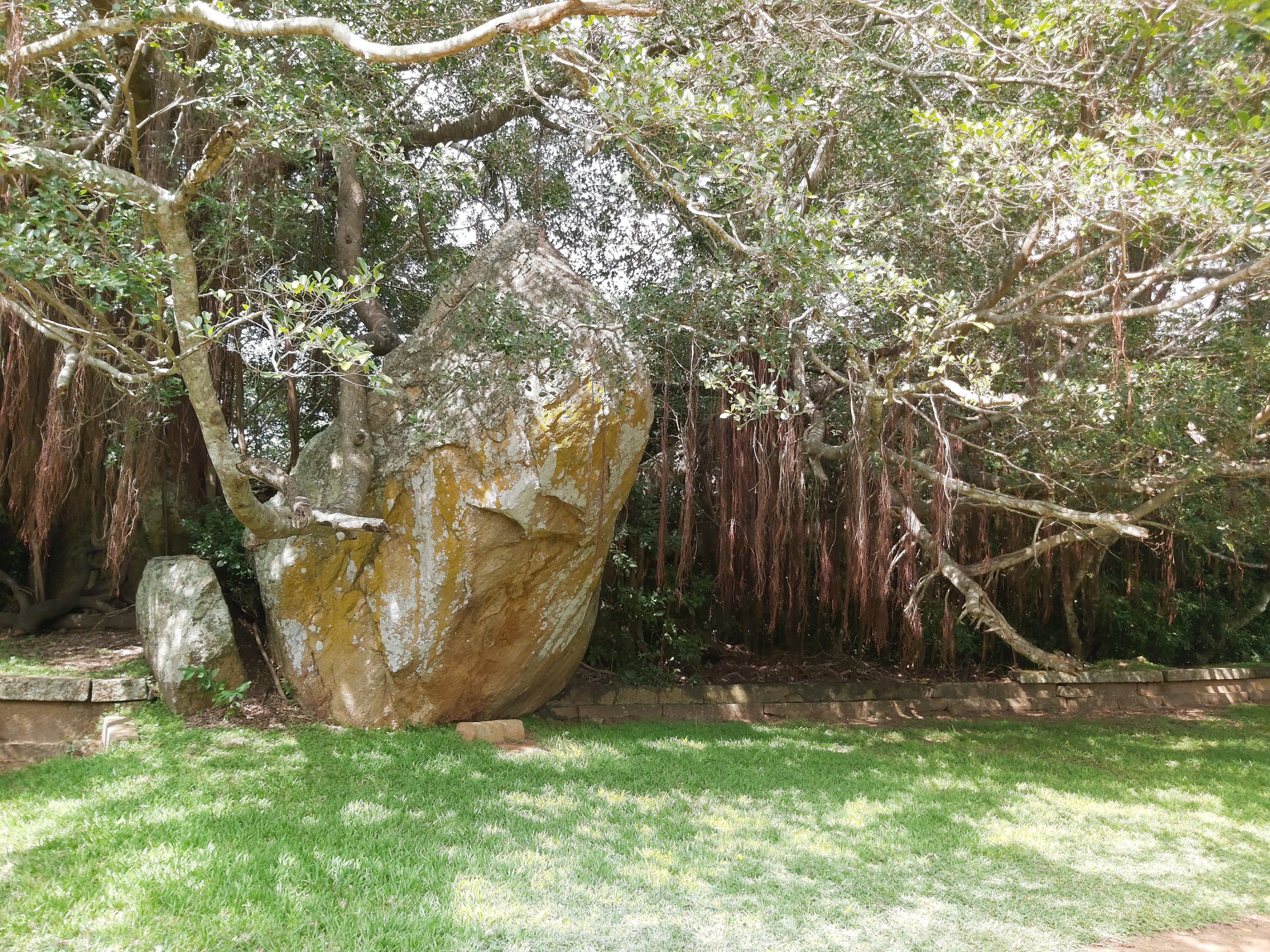 The ruins currently under restoration is thought to be that of a monastic retreat. At the start of the current trail is a gigantic man made pond thought to be the largest in Asia if not the world. Encompassing an area of 2.5 acres would have been a sight to see in its time. Currently this has been partly restored. Further down the trail, one is treated to exquisite stair ways the quality of pricision even todays technology would be hard pressed to deliver. The sharp edged stones and interlocking assembly speaks of a advanced technology lost to mankind now. The stone bridge which is to date sturdy as when it was set is engineering feat to behold. The Meandering stone laid path way up the hill is easy to climb due to gentle slope maintained. The path way has resting places at intervals to rest any weary feet. It is set in a circular fashion so that the monks can continue their walking meditation whilst resting and one such resting place has had water filled foot bath to soak ones feet. The carving of the stones in circular fashion is though provoking. The path leads to first of 2 buildings which is thought to have been surrounded by water with elevated floor boards. There are air inlets below the flow boards, which would have had a very cooling effect when air blows over the water. The area around these buildings and path way is littered with ruins of many other buildings. Off the path way is a man made waterfall, functioning even today. Made by blocking a water way with large carved stone slabs and the area below the water fall fashioned such that one could sit under the falling water or meditate. Stone steps carved in the rock enables one to climb to the sitting platform. The back of the waterfall and the surrounding is properly walled up to create a neat bathing pool.