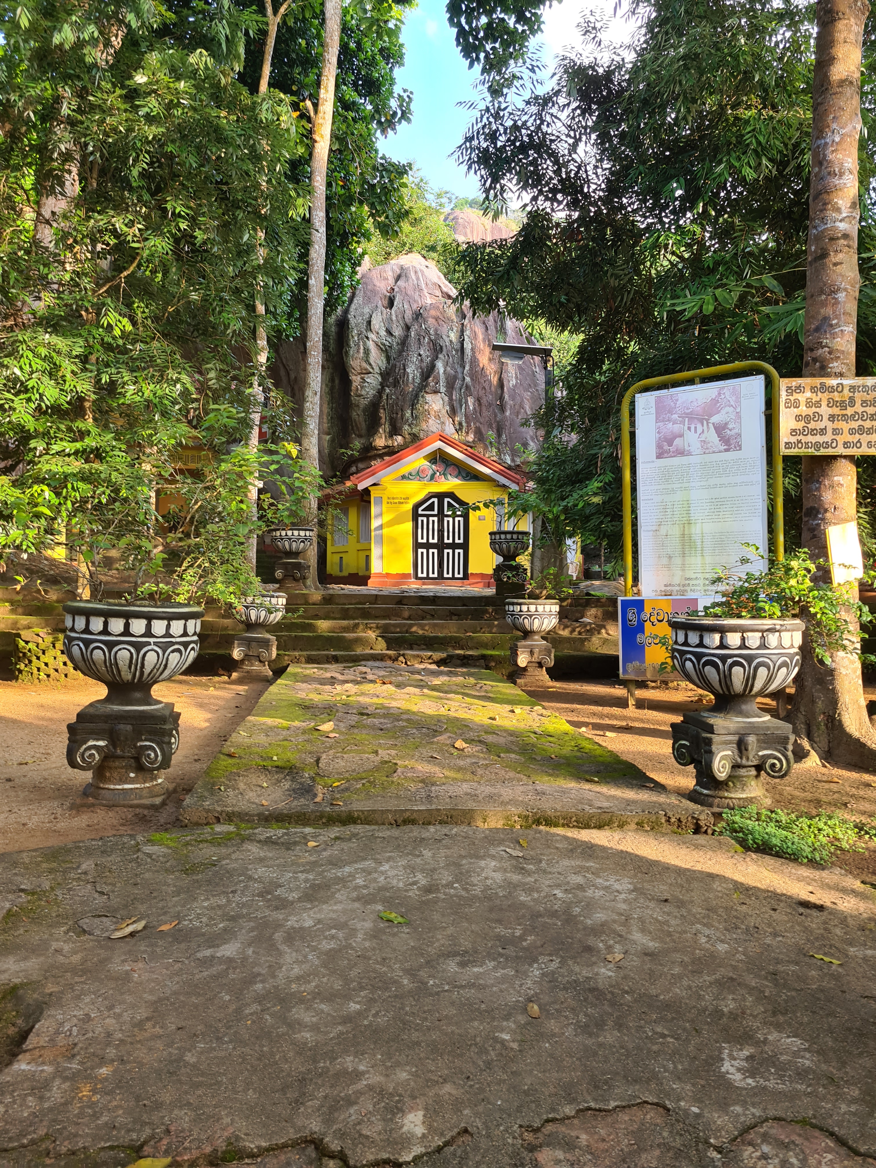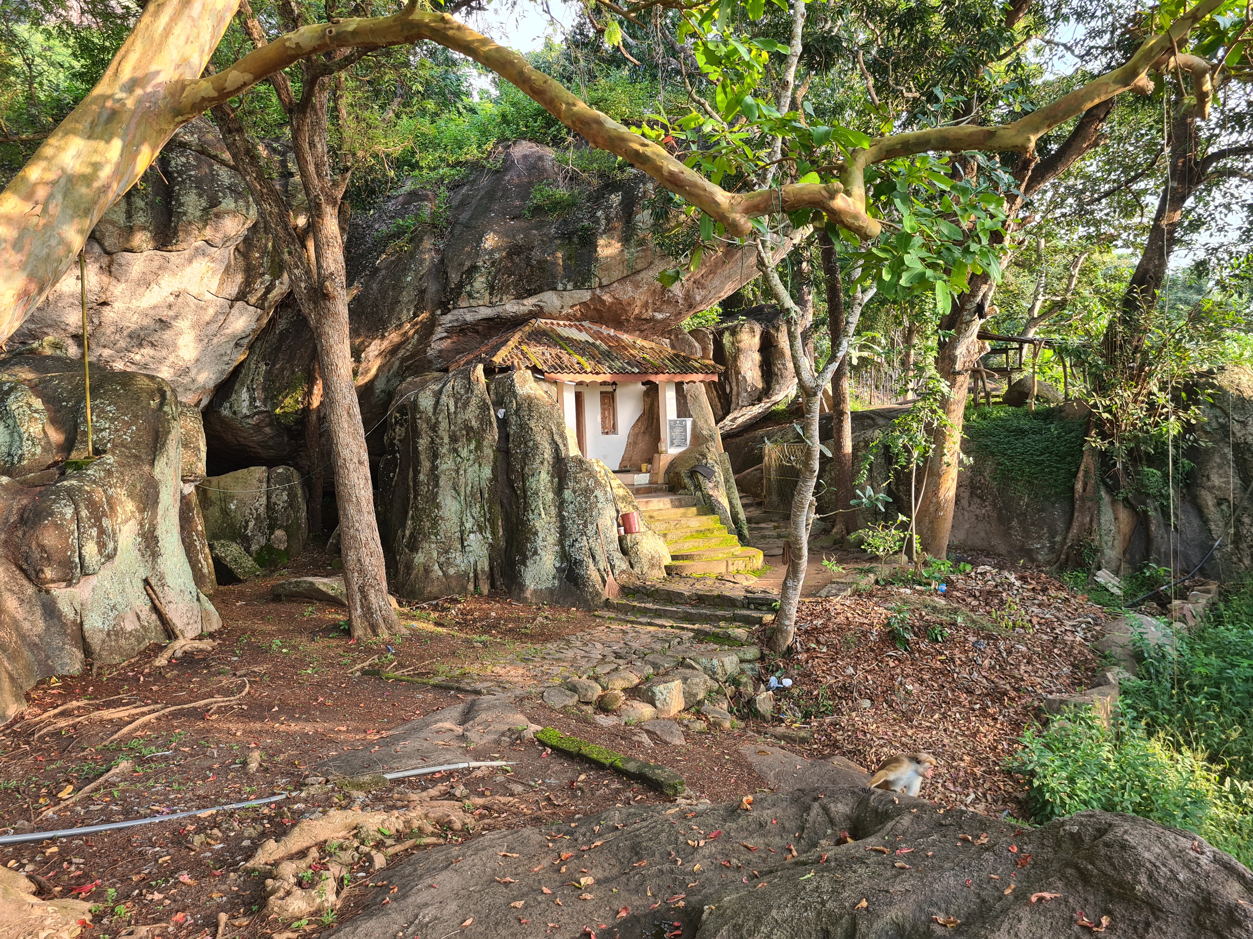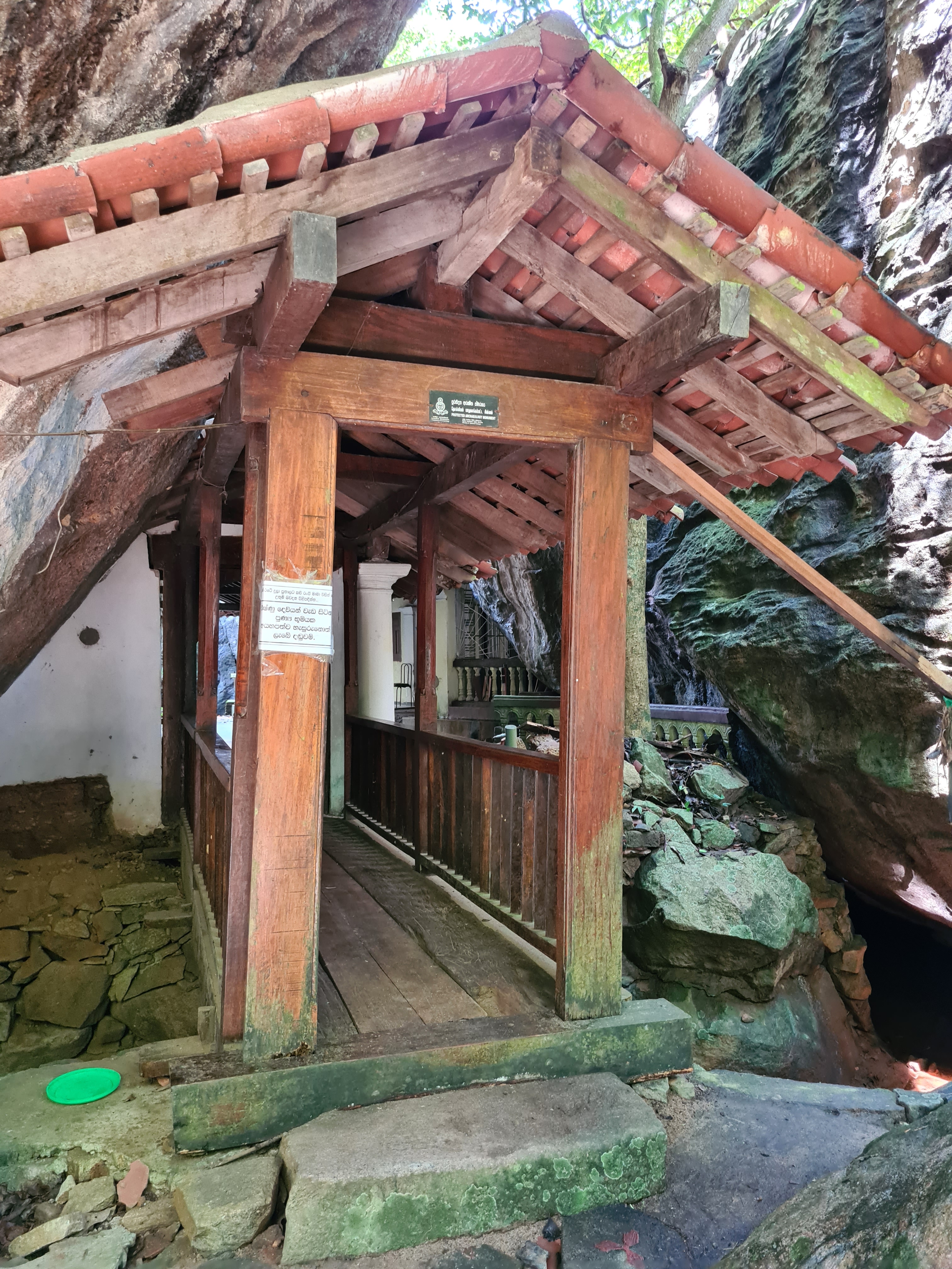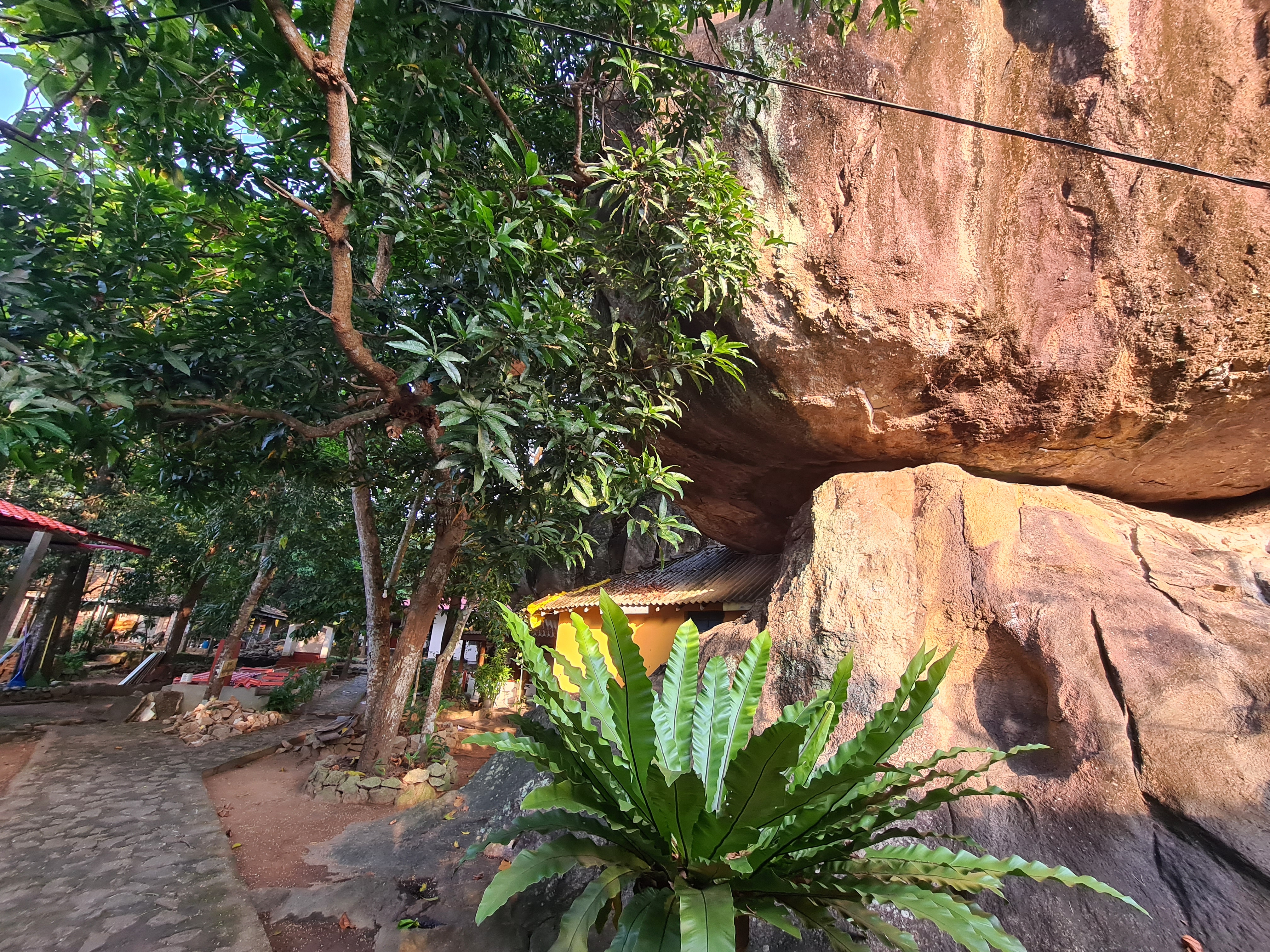 The place is on the mountain opposite the Alawala Pothgul Len Raja Maha Vehera, a quaint little cave temple. The road to the caves is the same as to the temple. The approach is motorable upto about 500m of the temple. The recently erected stairway leading to the caves is about 100ms past the sign post for the temple. There is no proper place to park, but one can leave the vehicle near the turn off to the temple. Its a easy climb upto the cave.